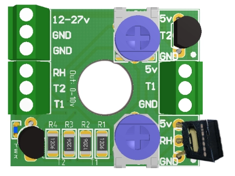 - В комплекте: cенсор влажности воздуха 0..100% HIH4000 (вставляется в колодку RH, калибруется потенциометрами индивидуально)